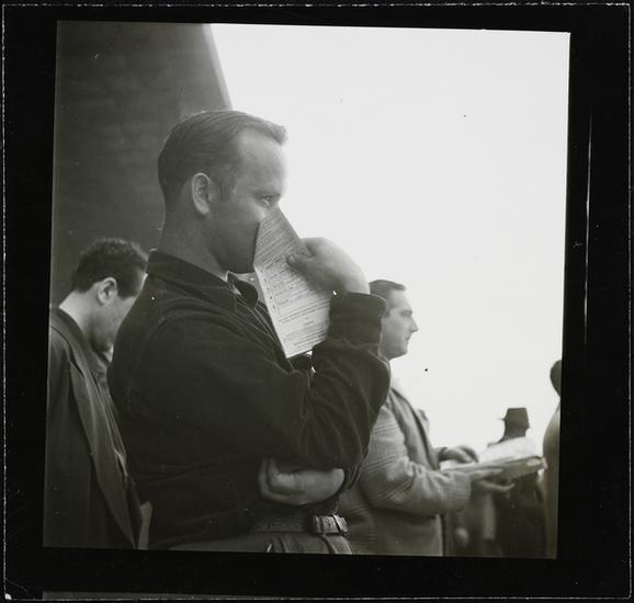 Aqueduct Race Track [Men with newspapers and racing forms at a racetrack.]