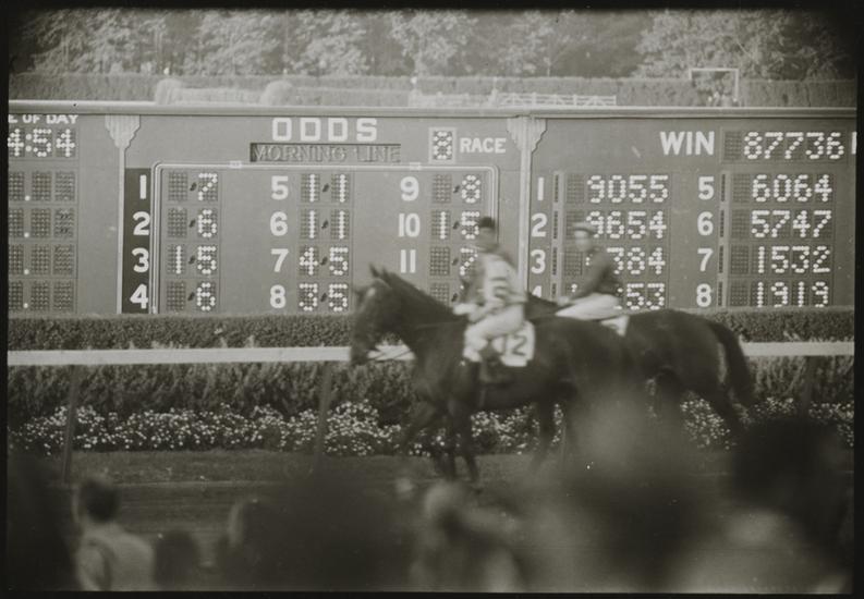 Aqueduct Race Track [Spectators watching a jockey on a racehorse being led to the racetrack.]