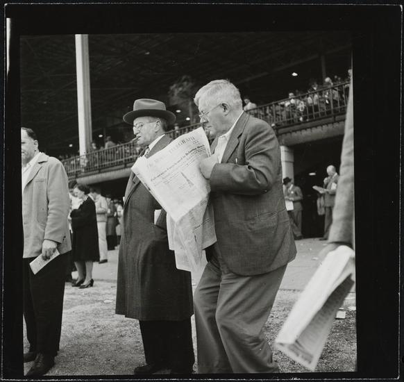 Aqueduct Race Track [Spectators reading newspapers at the racetrack.]