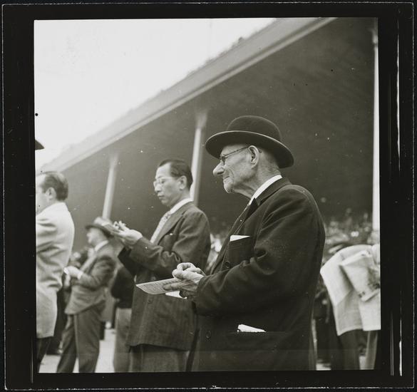 Aqueduct Race Track [Men with racing forms at a racetrack.]