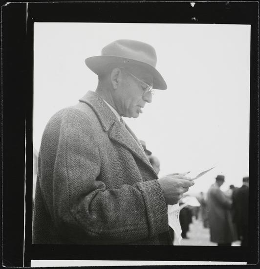 Aqueduct Race Track [Man looking at a racing form at a racetrack.]