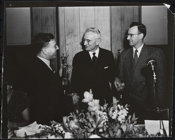 Dale Carnegie [Dale Carnegie shaking hands with a man holding a trophy.]