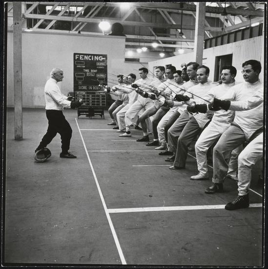 Columbia University [Jimmy Murray, fencing coach, with students.]