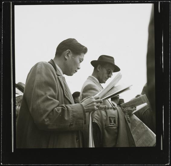 Aqueduct Race Track [Men reading newspapers at a racetrack.]