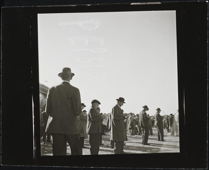 Aqueduct Race Track [Men reading newspapers at a racetrack.]