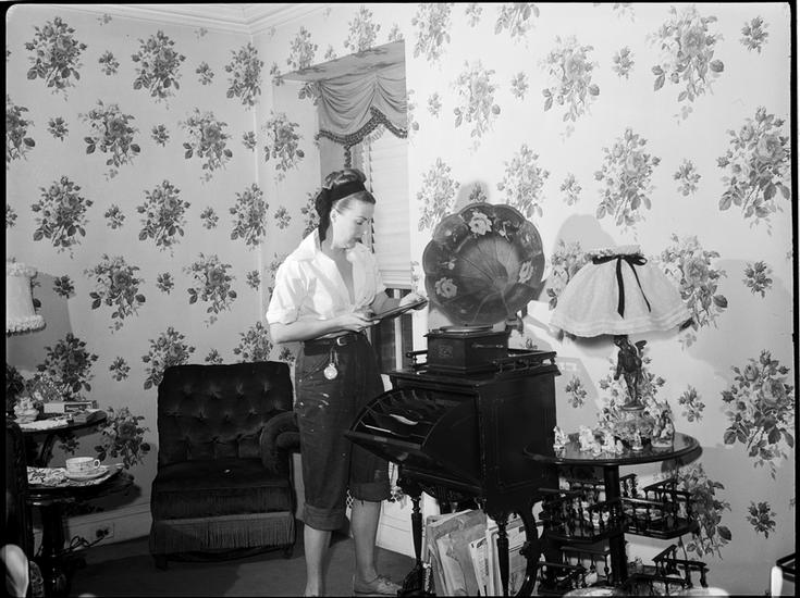 Gypsy Rose Lee [Gypsy Rose Lee and her son, Erik, listening to records.]