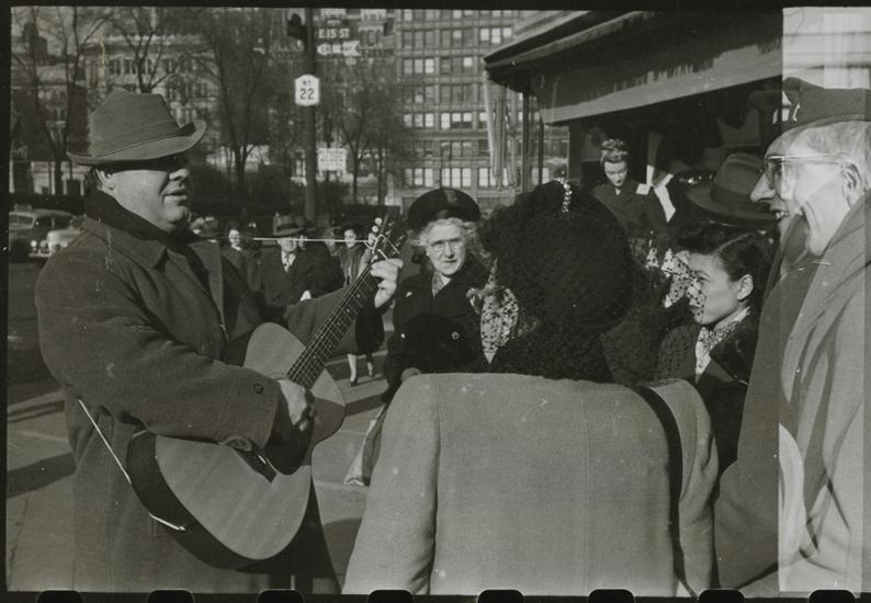 Burl Ives [Audience watching Burl Ives perform on the street.]