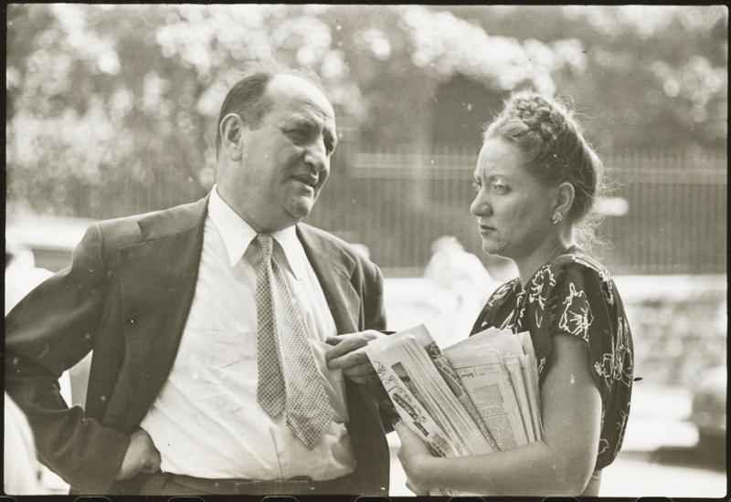 Bronx Street Scene [Man talking to a woman carrying newspapers.]