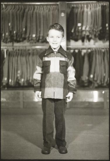 Bumper Baby Crop Now Gets Its First School Clothes [Boy modeling an outfit at a clothing store.]
