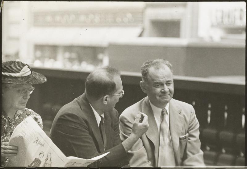 Bronx Street Scene [Two men talking as a woman reads a newspaper next to them.]