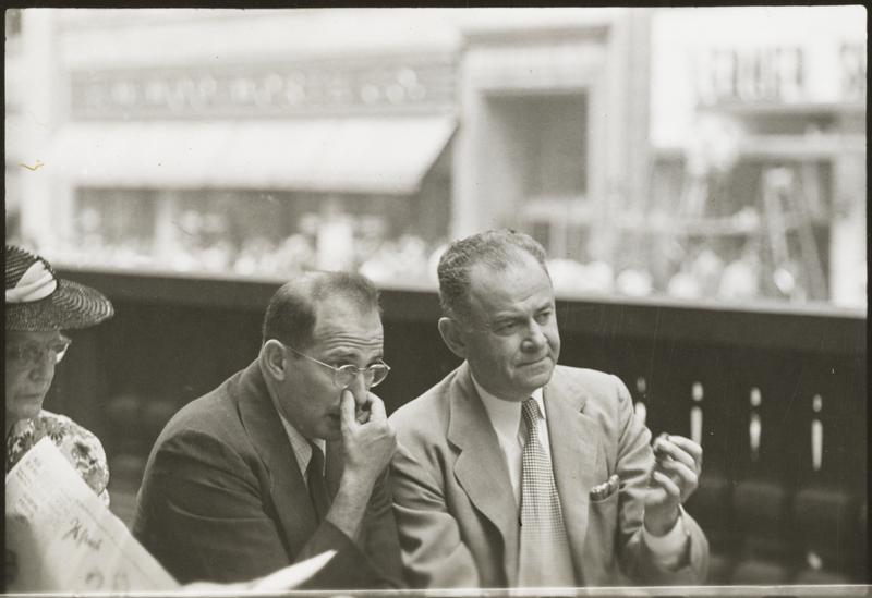 Bronx Street Scene [Two men talking as a woman reads a newspaper next to them.]