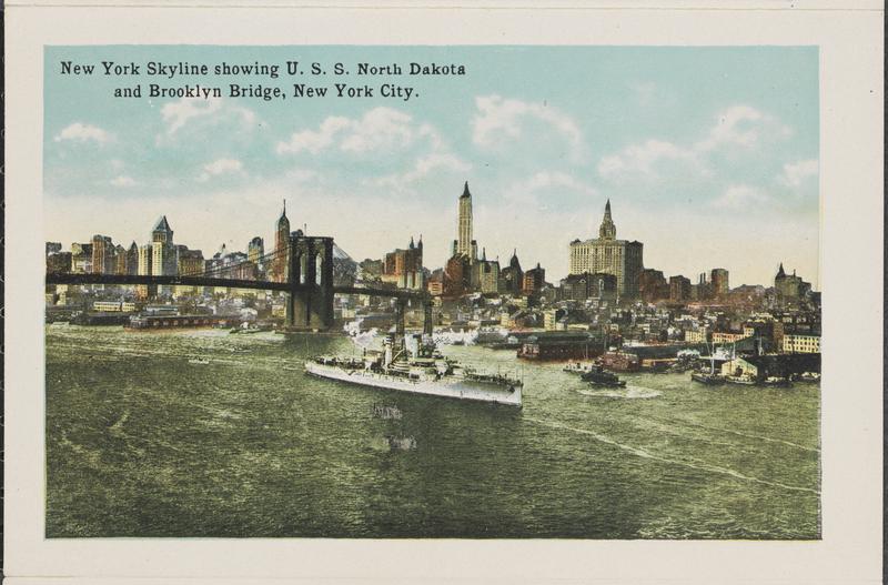 New York Skyline Showing U.S.S. North Dakota and Brooklyn Bridge.