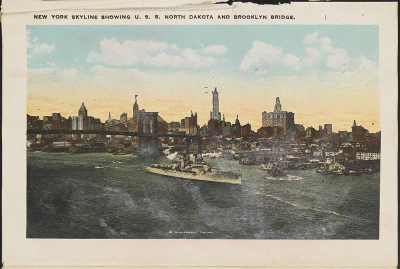 U.S.S. North Dakota & Brooklyn Bridge, New York.
