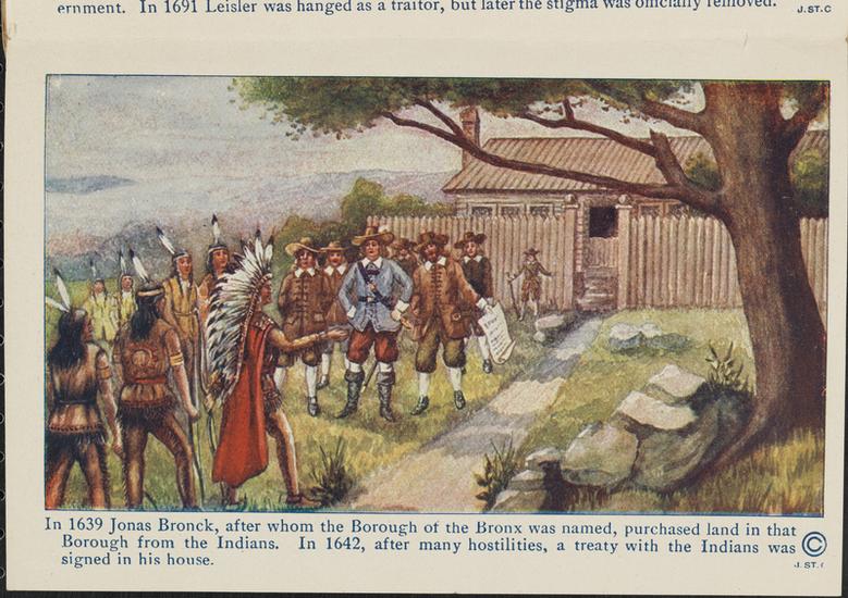 In 1639 Jonas Bronck, after whom the Borough of the Bronx was named, purchased land in that Borough from the Indians. In 1642, after many hostilities, a treaty with the Indians was signed in his house