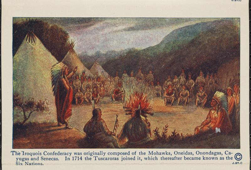 The Iroquois Confederacy was originally composed of the Mohawks, Oneidas, Onondagas, Cayugas and Senecas. In 1714 the Tuscaroras joined it, which thereafter became known as the Six Nations.