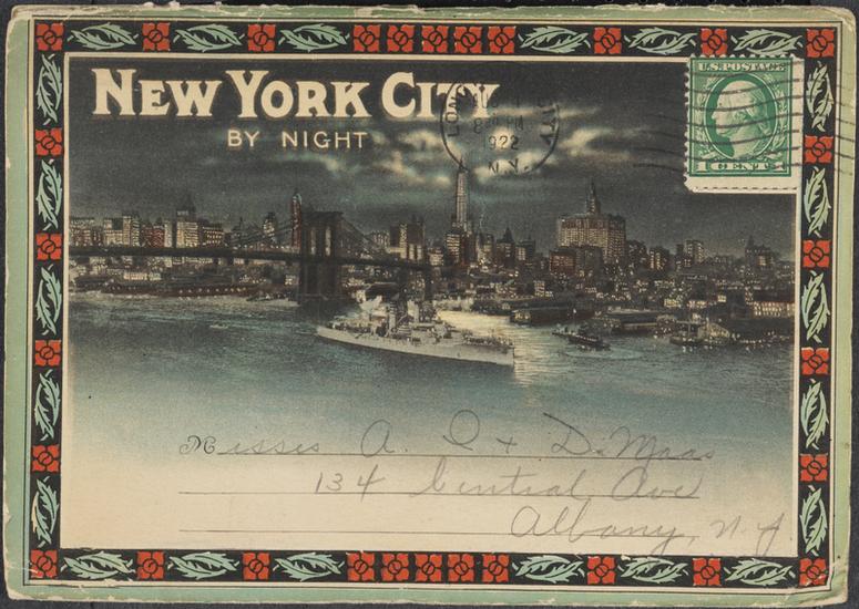 New York Skyline showing U.S.S. North Dakota and Brooklyn Bridge, New York City.