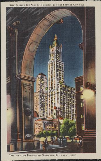 View Through Arch of Municipal Building Showing City Hall. Transportation Building and Woolworth Building at Night.