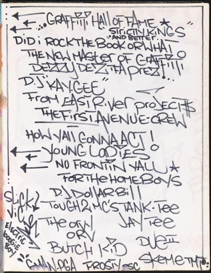 [Names of graffiti artists in TRC's piece book.]