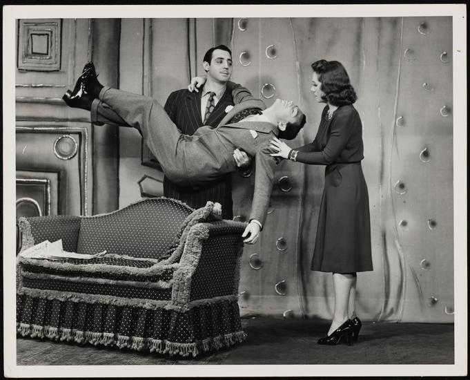 [Jack Durant as Ludlow Lowell, Gene Kelly as Joey Evans and Vivienne Segal as Vera Simpson in "Pal Joey".]