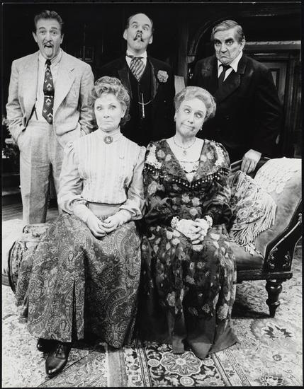[Barry Snider as Lieutenant Rooney, and Polly Holliday as Martha Brewster, Tony Roberts as Mortimer Brewster, and Jean Stapleton as Abby Brewster in "Arsenic and Old Lace".]
