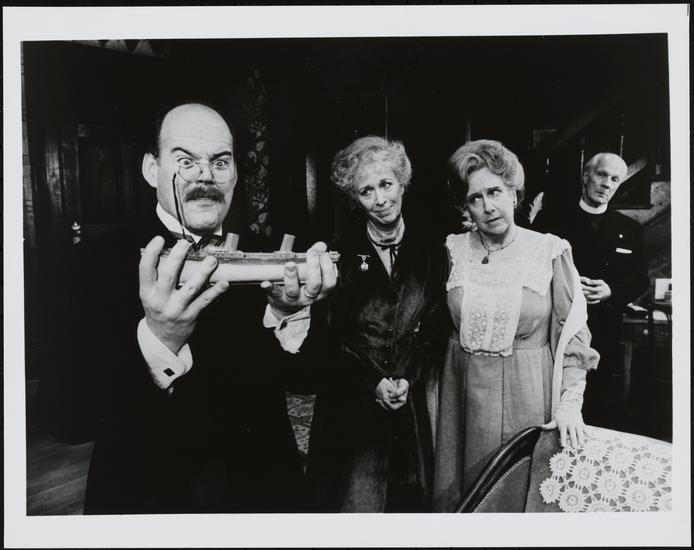 [Barry Snider as Lieutenant Rooney, and Polly Holliday as Martha Brewster, Tony Roberts as Mortimer Brewster, and Jean Stapleton as Abby Brewster in "Arsenic and Old Lace".]