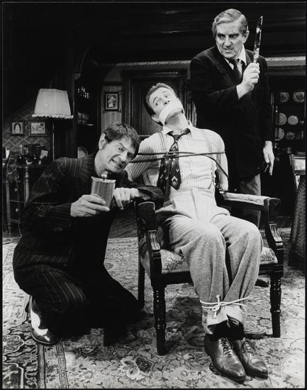 [Barry Snider as Lieutenant Rooney, and Polly Holliday as Martha Brewster, Tony Roberts as Mortimer Brewster, and Jean Stapleton as Abby Brewster in "Arsenic and Old Lace".]