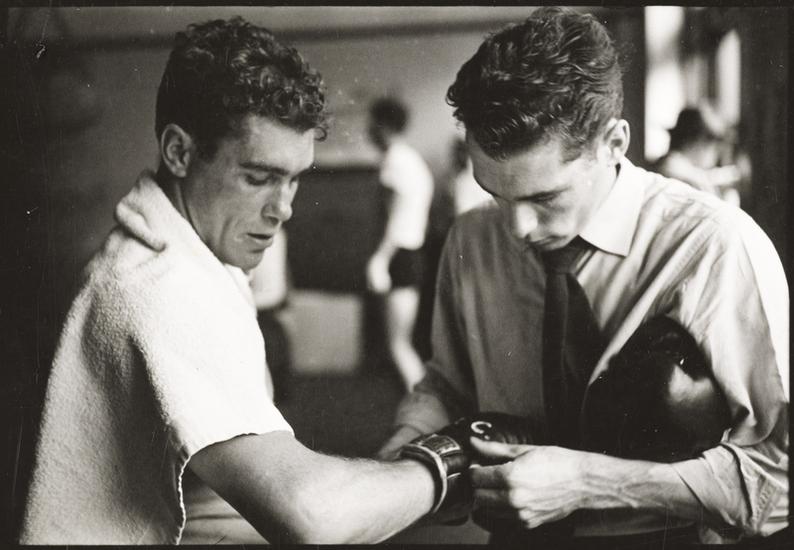 Walter Cartier, Prizefighter of Greenwich Village [Vincent Cartier helping Walter Cartier take his helmet and gloves off.]