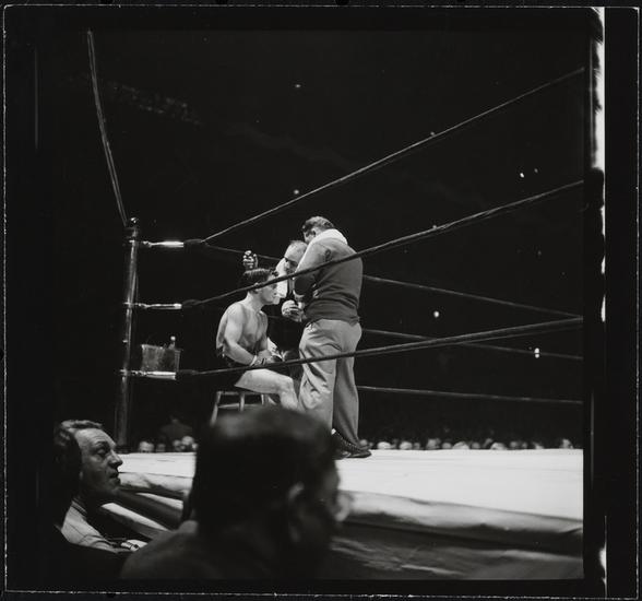 Fight Night at the Garden [Boxer talking to a man in the ring.]