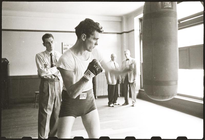 Walter Cartier, Prizefighter of Greenwich Village [Walter Cartier hitting a punching bag as men watch.]