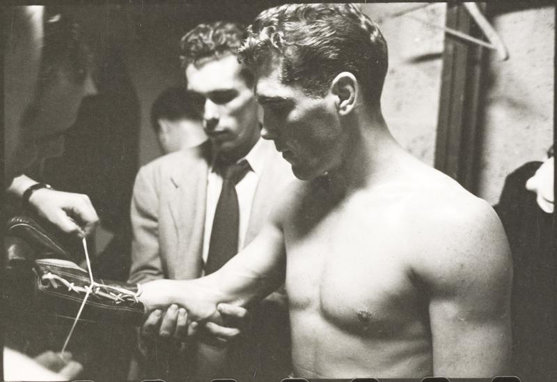 Walter Cartier, Prizefighter of Greenwich Village [Vincent Cartier helping Walter Cartier take his boxing gloves off.]
