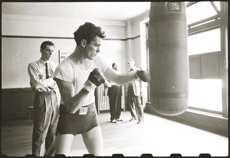 Walter Cartier, Prizefighter of Greenwich Village [Walter Cartier hitting a punching bag as men watch.]