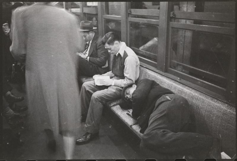 Life and Love on the New York City Subway [Passengers in a subway car, including a man sleeping on the seats.]