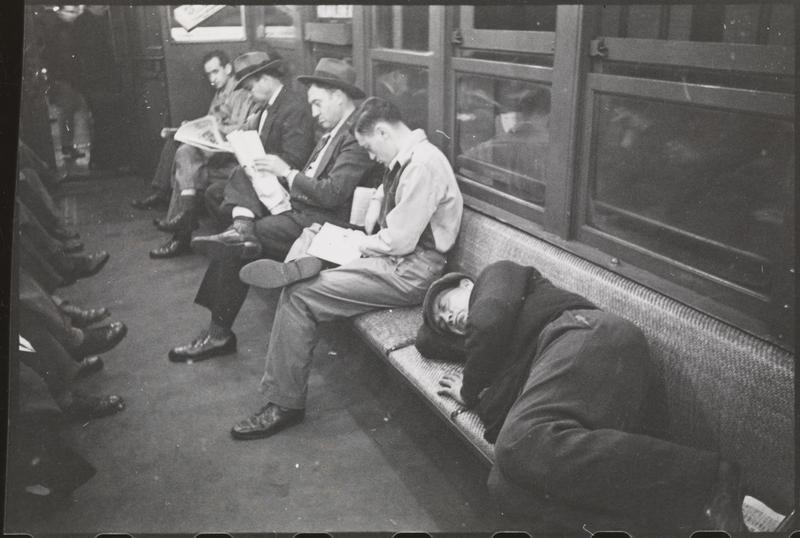 Life and Love on the New York City Subway [Passengers in a subway car, including a man sleeping on the seats.]