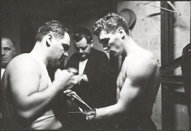 Walter Cartier, Prizefighter of Greenwich Village [Man adjusting Walter Cartier's boxing gloves.]