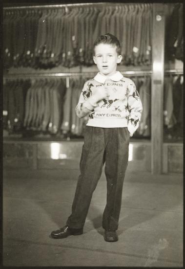 Bumper Baby Crop Now Gets Its First School Clothes [Boy modeling an outfit in a clothing store.]