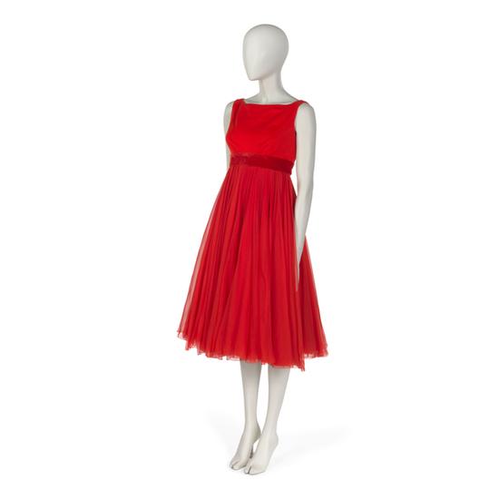 Evening ensemble comprising dress and poncho in red and green double-knit wool jersey