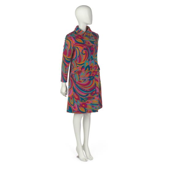 Ensemble comprising ankle-length coat and miniskirt in red vinyl