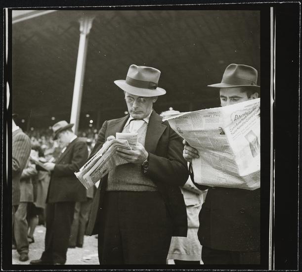 Aqueduct Race Track [Spectators reading newspapers at the racetrack.]