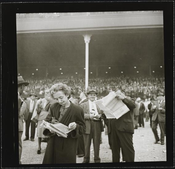Aqueduct Race Track [Audience in the grandstand at a racetrack.]