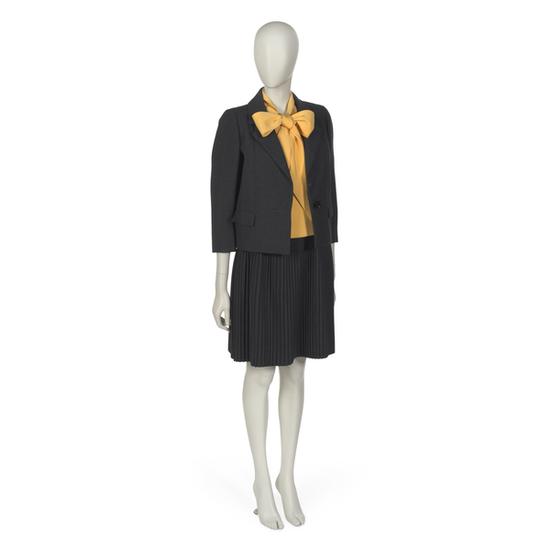 Ensemble in grey wool twill, comrpising dress, jacket, and belt
