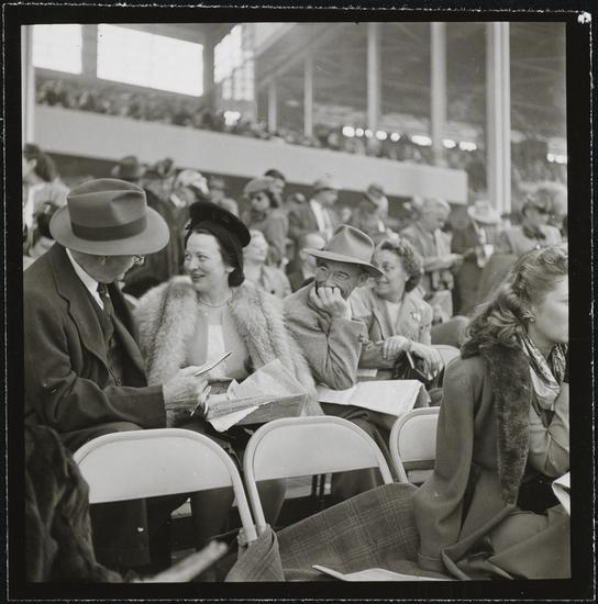 Aqueduct Race Track [Audience in the grandstand at a racetrack.]