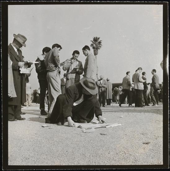 Aqueduct Race Track [Man crouched, reading a newspaper.]