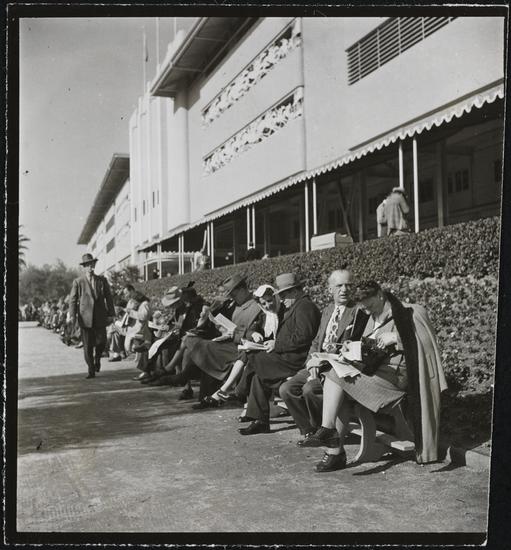 Aqueduct Race Track [People sitting on benches and reading at the racetrack.]