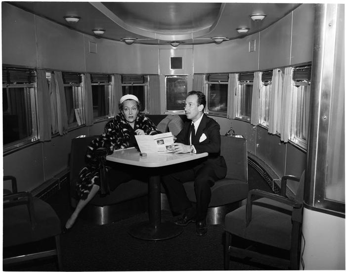 [José Ferrer as Oscar Jaffe and Gloria Swanson as Lily Garland in "Twentieth Century".]