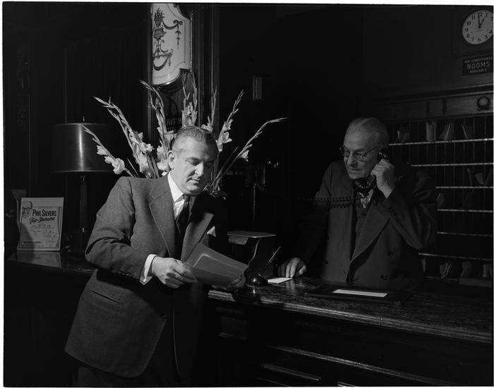 [Mr. Mitchell behind the desk at the Hotel Algonquin.]