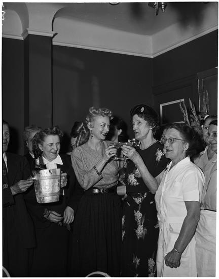 [Virginia de Luce and Miss Cramer toasting at the Hotel Algonquin.]