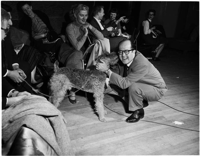 [Ted "Sport" Morgan and Phil Silvers at a recording session for "Top Banana".]