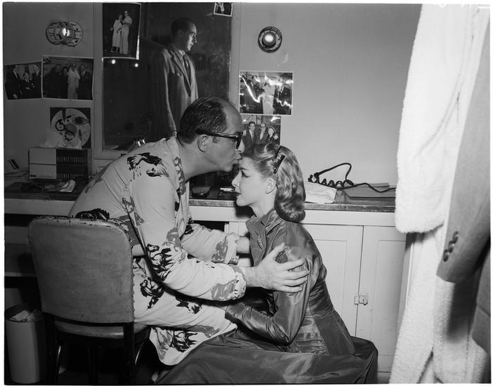 [Phil Silvers and Joan Fields backstage at "Top Banana".]