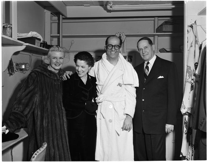 [Phil Silvers, Paula Stone, Mike Sloane and Jack Donohue backstage at "Top Banana".]