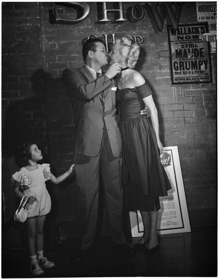 [Jack Carson with other performers at an autograph session.]